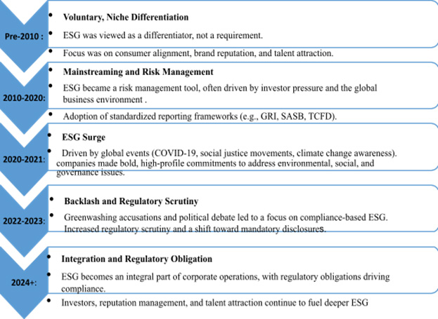 The evolution of ESG shows a remarkable shift from voluntary activities to mandatory compliance actions that have been shaped by both pressures from external agencies as well as internal corporate strategies. Although currently, the regulatory frameworks are setting the standards, businesses in the coming years will be more prone to look beyond the basic compliance standards as they aim to integrate ESG into their core business processes and other long-term goals. Soon, ESG will likely continue to expand its horizons, as a key driver of innovation, resilience, and sustainable growth in a fast-developing scenario while also being a tool for risk management for business entities. The ESG era moving from voluntary to mandatory requirements has been presented in Fig. 1.
