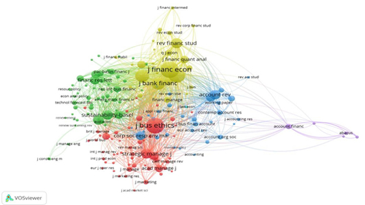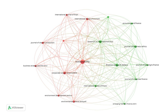 Prominent journals such as the Journal of Business Ethics, Corporate Social Responsibility and Environmental Management, Sustainability, and Finance Research Letters show strong coupling strengths, suggesting that new work in these fields draws from comparable foundational sources.