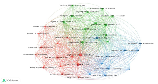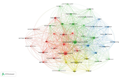 The ESG-focused aspect of capital structure research, in which sustainability metrics are increasingly used to inform financial decision-making, is encapsulated in the second cluster.