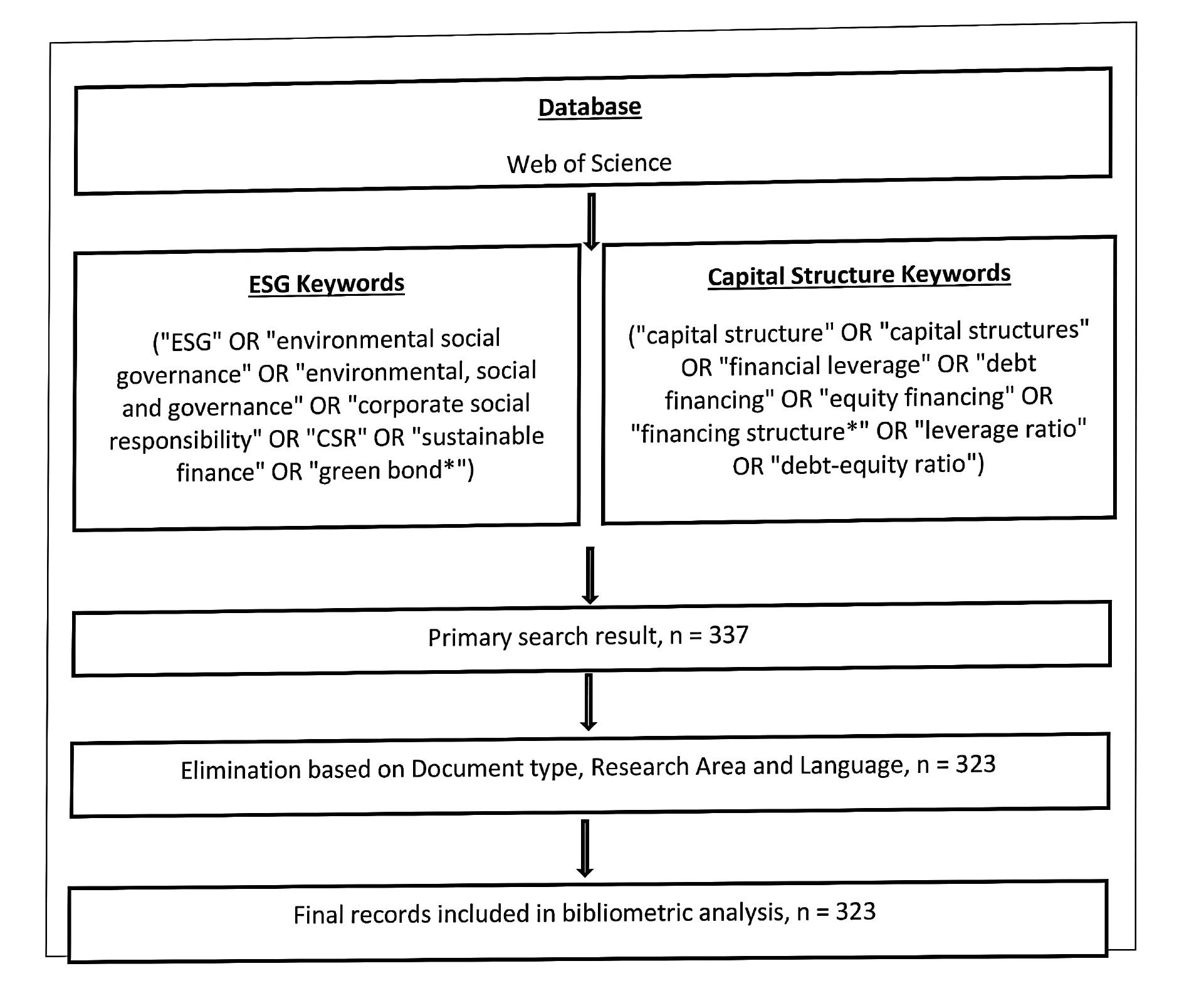 To capture research at the intersection of ESG performance and capital structure, a carefully constructed Boolean search string was employed: